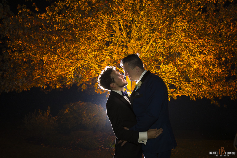 Night wedding portraits are always worth the few minutes it takes to create them. The contrast between the dark trees and soft lighting created a dramatic, romantic atmosphere for Adam and Eric’s final portraits of the night.